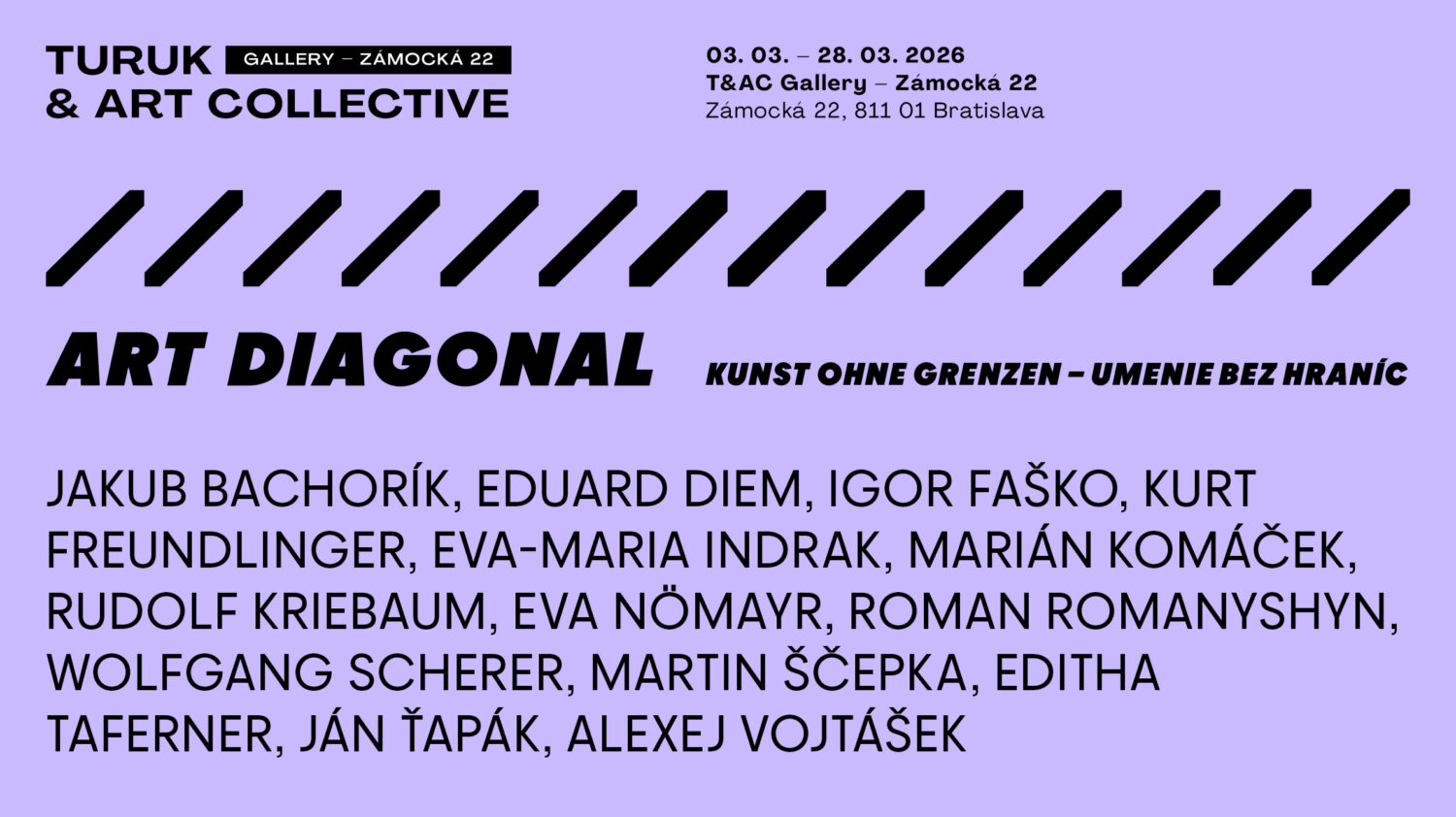 S potešením Vás pozývame na výstavu  Medzinárodného klubu umelcov ART DIAGONAL – Kunst ohne Grenzen (Umenie bez hraníc) od 3.3. do 28. 3. 2026 v T&AC Gallery Zámocká 22 v Bratislave.
